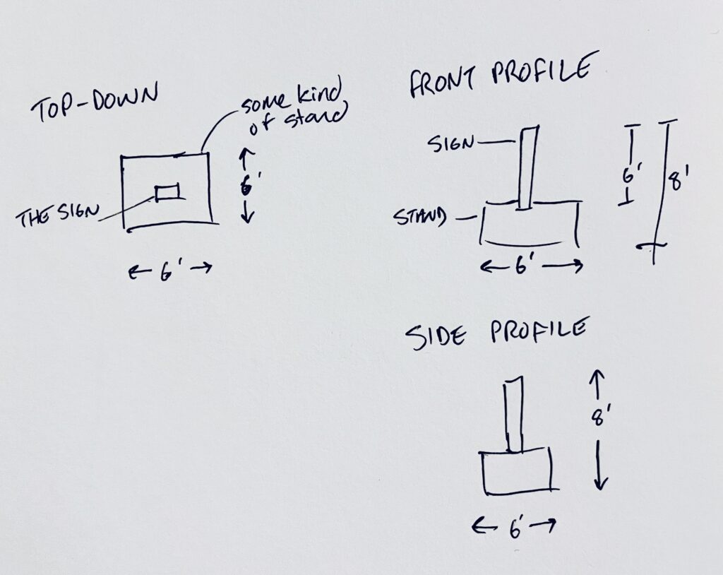 Concept Art, showing person for scale and “some kind of stand” in black.